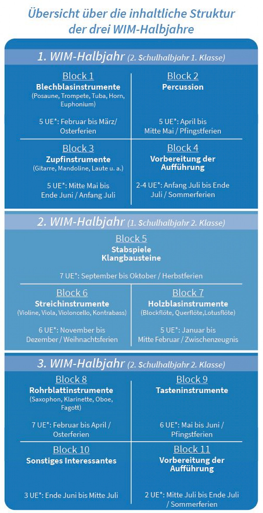 Die Gesamtkonzeption des WIM-Programmes ist so angelegt, dass ausnahmslos alle Kinder, die das erste und zweite Schuljahr besuchen, kostenfreien musikpraktischen Unterricht in der Grundschule erhalten sollen. Der Unterricht wird im sogenannten „Tandem“ mit der gesamten Grundschulklasse im Rahmen des regulären Unterrichtes durchgeführt (eine Grundschullehrkraft und eine externe Musikfachkraft, hier WIM-Lehrkraft genannt, gestalten den Unterricht gemeinsam).